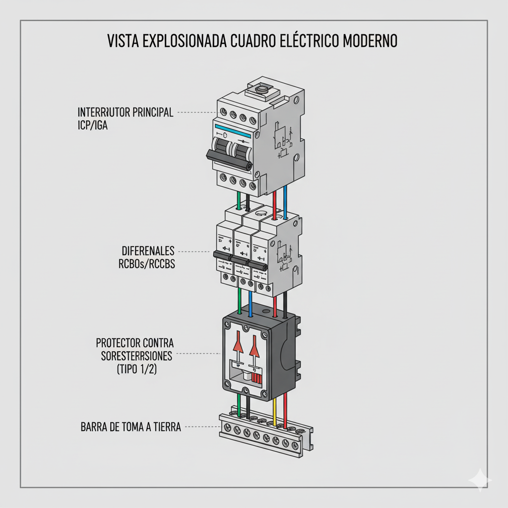 Corte total en una sola acción. Obligatorio en cuadros modernos. - Protección contra sobretensiones (SPD tipo 1/2/3)